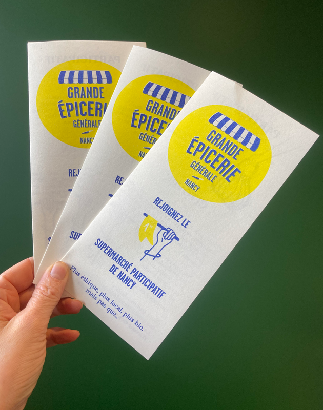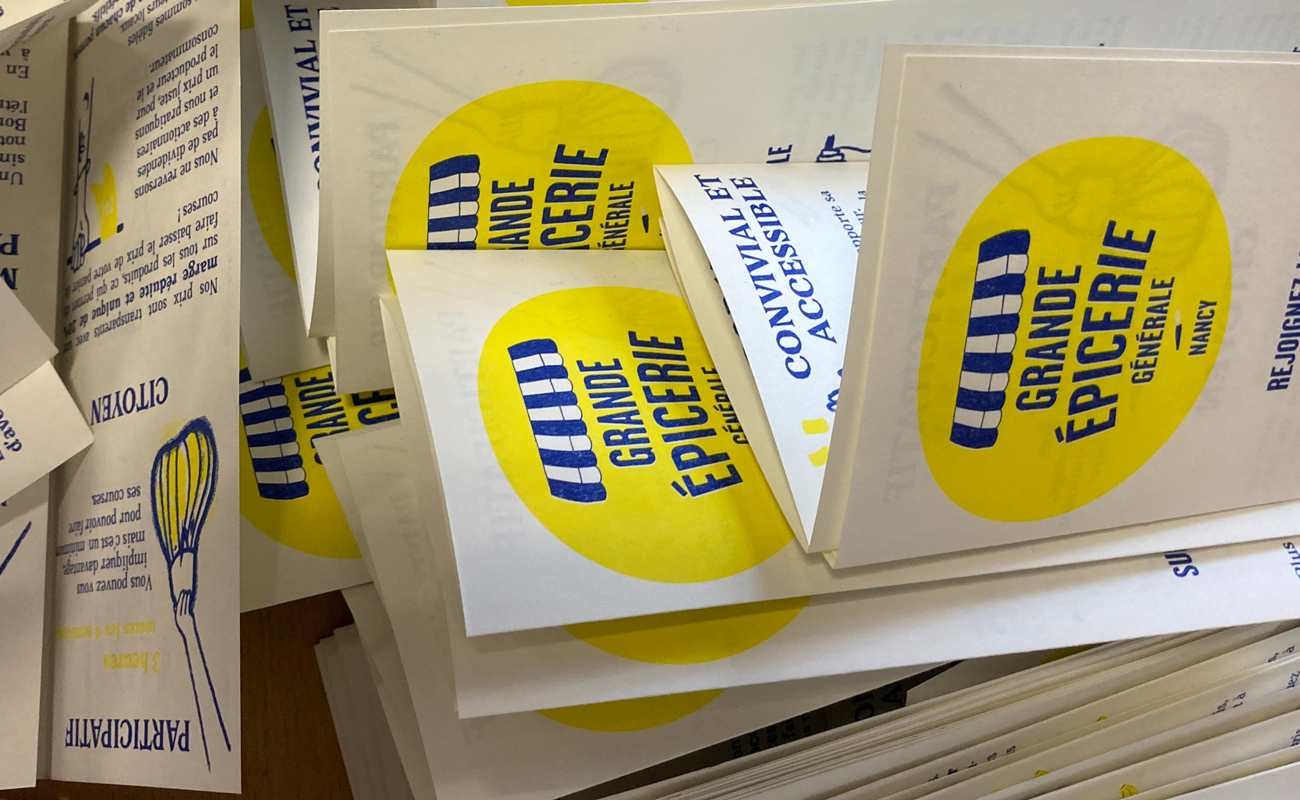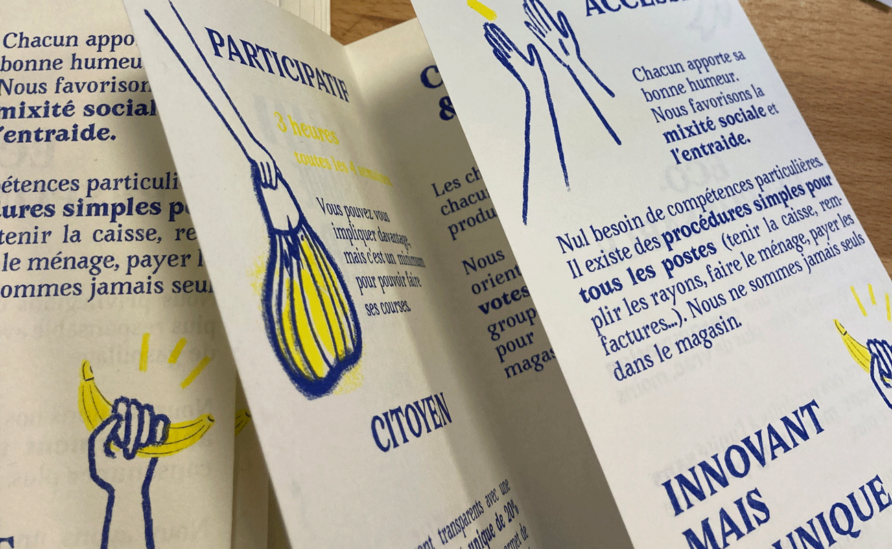 La Grande épicerie générale avait besoin de nouveaux supports de communication afin de trouver de nouveaux adhérents et de bosser son activité. Ses membres m’ont donc passé commande pour la réalisation d’un flyer. Viendront ensuite des projets de fresque et d’enseigne ( j’ai hâte! ).