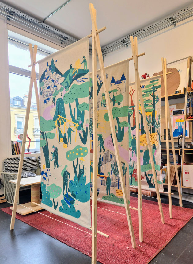 Dans le but de présenter leur nouveau média « la voie des bois », l’association m’a commandé la conception, la réalisation et la fabrication de 3 portants en bois présentant un décor peint sur tissu des 3 univers différents représentés par le média : la nature en ville / à la campagne / en forêt.